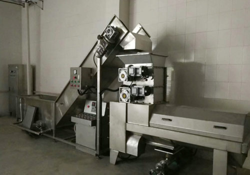 將經(jīng)過挑選、清洗的新鮮石榴切口、擠開、分離出石榴皮,并將果漿輸送至壓榨機(jī)進(jìn)行下道工序的生產(chǎn)。