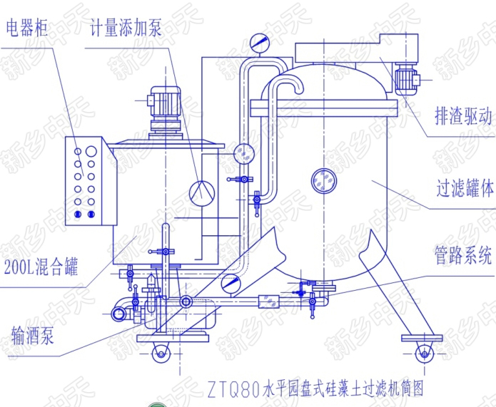 8、本機(jī)所選用的硅藻土添加泵為隔膜式計(jì)量泵,其采用國(guó)外技術(shù)生產(chǎn),結(jié)構(gòu)簡(jiǎn)單,計(jì)量精確,且可根據(jù)待濾液的渾濁程度,隨時(shí)調(diào)節(jié)硅藻土等助濾劑的添加量。