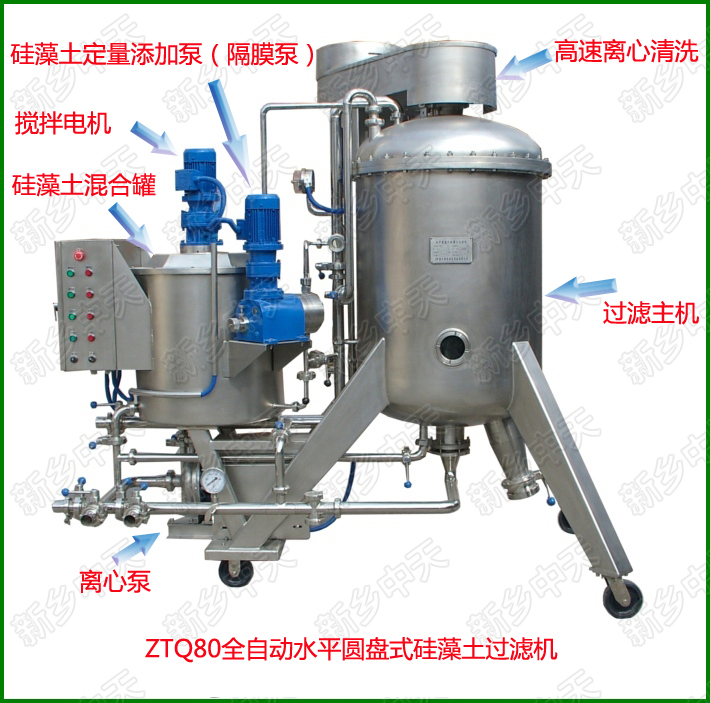 過(guò)濾時(shí),首先在過(guò)濾盤上形成硅藻土預(yù)涂層。被過(guò)濾的液體經(jīng)硅藻土預(yù)涂層時(shí),其中的雜質(zhì)即被阻擋;而純靜的液體經(jīng)過(guò)微觀管狀或片狀的間隙以及顆粒之間的間隙通過(guò)過(guò)濾層,從而起到過(guò)濾作用。隨過(guò)濾時(shí)間的推移,在預(yù)涂層上被濾掉的雜質(zhì)會(huì)越來(lái)越多,且將阻塞過(guò)濾通道。因此在過(guò)濾過(guò)程中,還需對(duì)進(jìn)入過(guò)濾罐的被過(guò)濾的液體,添加一定劑量相應(yīng)粒度的硅藻土,以維持正常的過(guò)濾過(guò)程。另外,如果過(guò)濾時(shí)需要脫色,還需加入一定比例的活性炭。