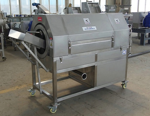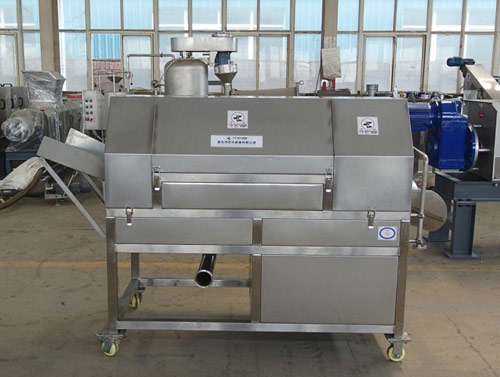 該轉(zhuǎn)篩為內(nèi)篩式過濾,通過篩網(wǎng)上焊接的內(nèi)螺旋不停的轉(zhuǎn)動,逐漸把脫水后的固形物推出去,過濾后的清液經(jīng)轉(zhuǎn)篩外的不銹鋼腔體收集后從管路排出,從而達到固液分離的目的。